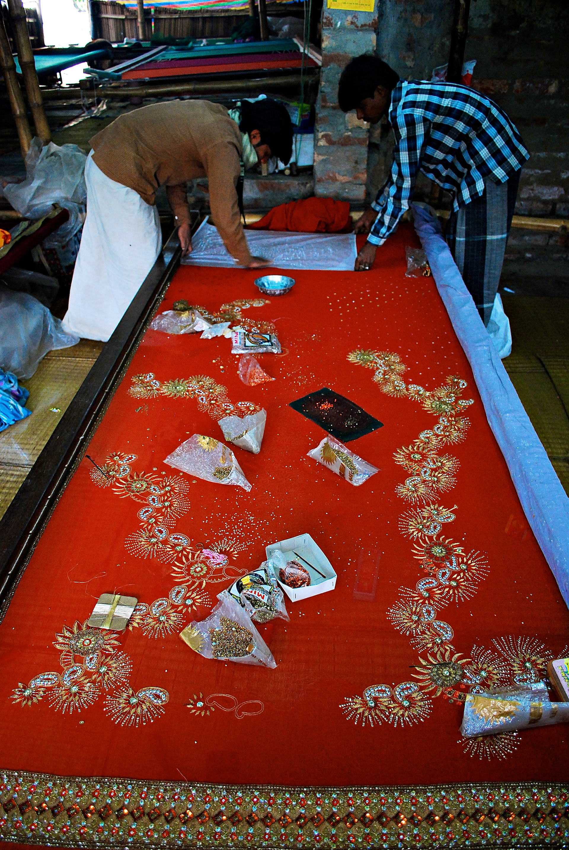 Even in this age, the embroidery is completely done manually by the craftsmen without the use of any machinery whatsoever. The work is so intricate and strenuous to the eye that it takes almost 2-3 days to complete a six meter sari with 5-6 craftsmen continuously working on it. During the peak business season that coincides with Dushera, Diwali and Eid, the workshops are cramped with over 12-14 craftsmen working on a sari for over 18 hours at a stretch. While an apprentice gets paid about Rs 2 per hour, the expert craftsmen earn about Rs 18 per hour.