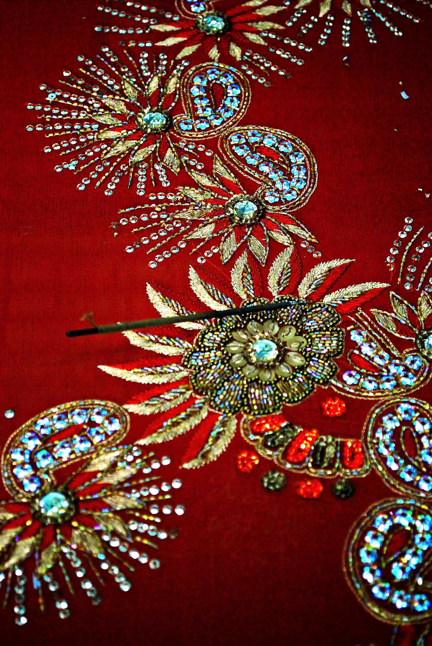 Sitting inside his damped workshop, Sheikh Mosibur Rehman; a fifth generation Zardoz (a Zardozi craftsman) nostalgically recalls how his forefathers were referred as ‘gardeners of garments’ in praise of the intricate floral motifs they perfectly and painstakingly embroidered with their small crochet-hooked needle! Traditionally, the art of Zardozi only used gold and silver wire along with precious gems and diamonds but with time silk and other shining threads like dabkaa (a combination of gold and silk threads), kasab (silver or gold-plated silver thread) and bullien (copper and brass coated threads) replaced them. Precious gems have given way to sitaaras or metal stars, round sequins, glass and plastic beads, even though the process of embroidery remains the same.